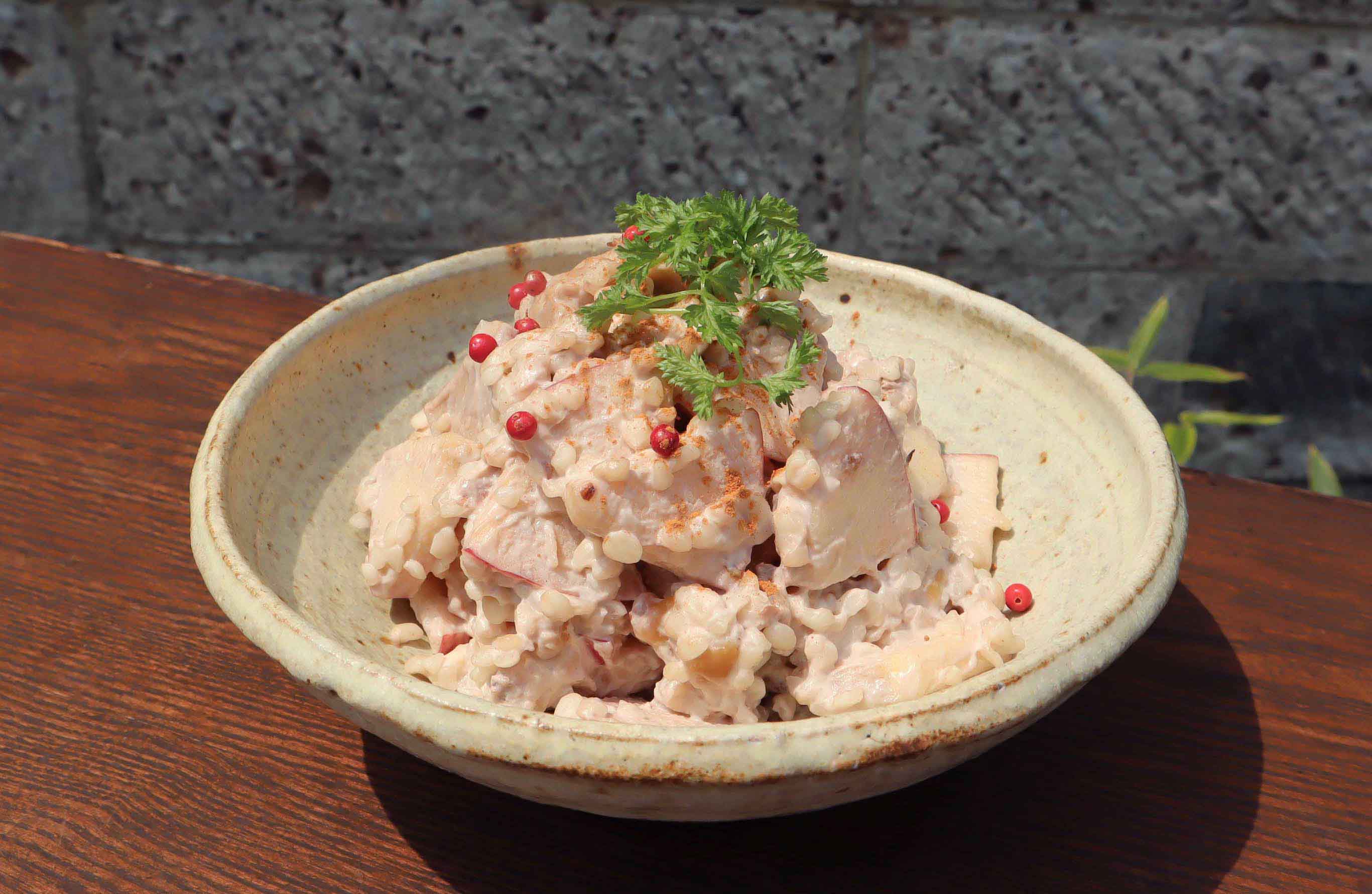 地元産の農産物をふんだんに使い、和食を軸に他国の料理のエッセンスも随所に取り入れ、石の蔵でしか味わえないお料理を提供しています。